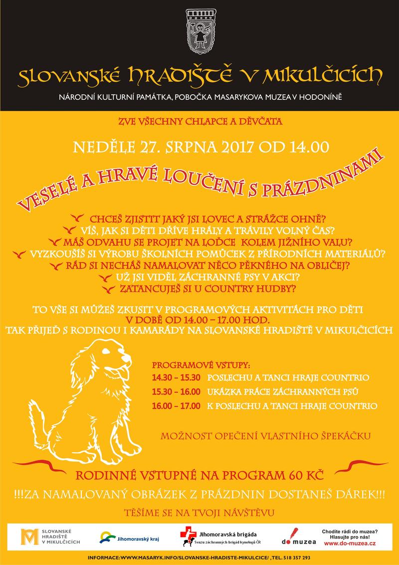 Návštěvu hradiště Velké Moravy v Mikulčicích a poznání historie i památek na dávné časy počátků české státnosti můžete spojit s osobní aktivní účastí dětí na bohatém programu, který pro rodiče s dětmi připravil na tuto neděli 27. srpna kolektiv spolupracovníků pod vedením pana Mgr. Zdeňka Grombiříka. Dobrou náladu zajistí místní country hudba a pro děti je připraven bohatý a zajímavý program, který je popsán na připojeném programovém plakátě. Přijeďte! I loučení může být veselé. :-) -fs-