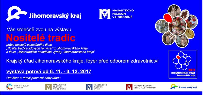 V budově Krajského úřadu Jihomoravského kraje se představuje putovní výstava Nositelé tradic, která prostřednictvím 24. barevných bannerů přehledným a poutavým způsobem seznamuje širokou veřejnost s prací Nositelů tradice lidových řemesel a Mistrů tradiční rukodělné výroby Jihomoravského kraje.