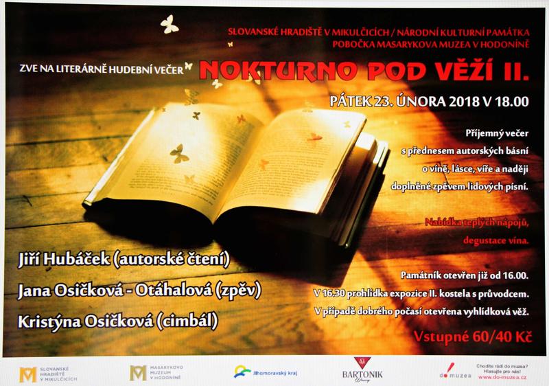 V souladu s naším mottem: I v zimě můžete do muzea! srdečně zveme naše přátele na další akci cyklu Nokturno pod věží, která se uskuteční v pátek 23. února 2018 od 18.00 hodin. V netradičně pojatém literárně-hudebním pořadu představí svou tvorbu Jiří Hubáček a zazpívá Jana Osičková - Otáhalová za doprovodu cimbalistky Kristýny Osičkové. Kromě uměleckých ochutnávek budou připraveny i teplé nápoje a víno. Zájemci budou moci také na prohlídku s průvodcem a dle počasí vystoupat i na vyhlídkovou věž. Přijďte, bude to jistě krásný večer i program. -fs-
