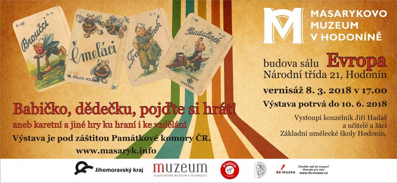 Zveme Vás na vernisáž výstavy Babičko, dědečku, pojďte si hrát! Vernisáž se uskuteční 8. března v 17.00 hodin v sále Evropa. Na vernisáži vystoupí kouzelník Jiří Hadaš a učitelé a žáci Základní umělecké školy Hodonín. Vstup zdarma.