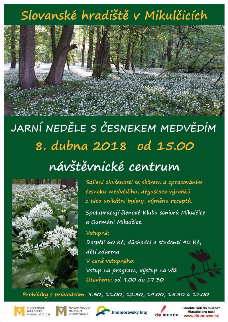 Všechny obdivovatele a milovníky česneku medvědího srdečně zveme na tematické odpoledne zaměřené právě na tuto jarní bylinu, která se hojně v okolí našeho hradiště vyskytuje. Ve společnosti seniorek z Mikulčic se o této zdraví podporující bylině nejen dozvíte mnoho zajímavého, ale můžete si odnést nejen vjemy chuťové po ochutnávce zdravých výrobků, ale i receptury pro jejich domácí přípravu. Věříme, že vás tematický program zaujme a odnesete si mnoho poznatků i listů zdravé byliny. -fs-