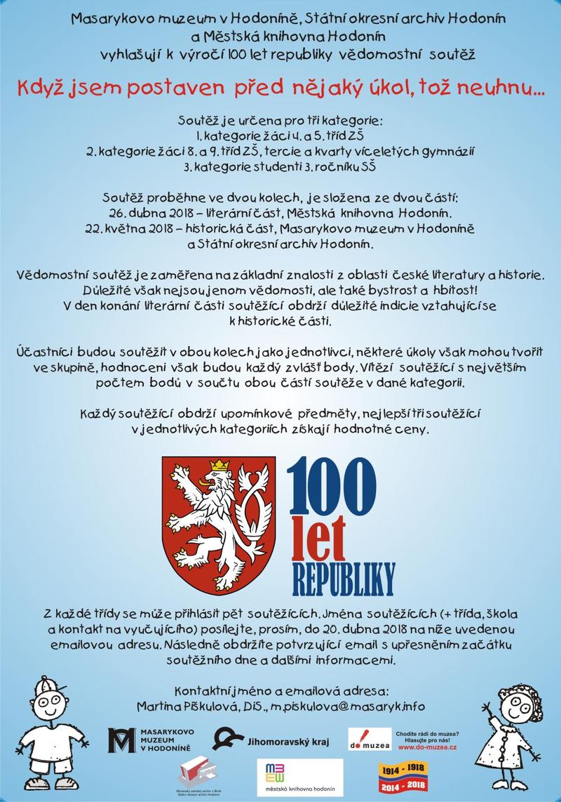 Milí žáci a studenti, Masarykovo muzeum v Hodoníně, Státní okresní archiv Hodonín a Městská knihovna Hodonín si Vás a Vaše žáky a studenty dovolují oslovit s nabídkou doprovodného programu vědomostní soutěže k výročí 100 let republiky s názvem Když jsem postaven před nějaký úkol, tož neuhnu…