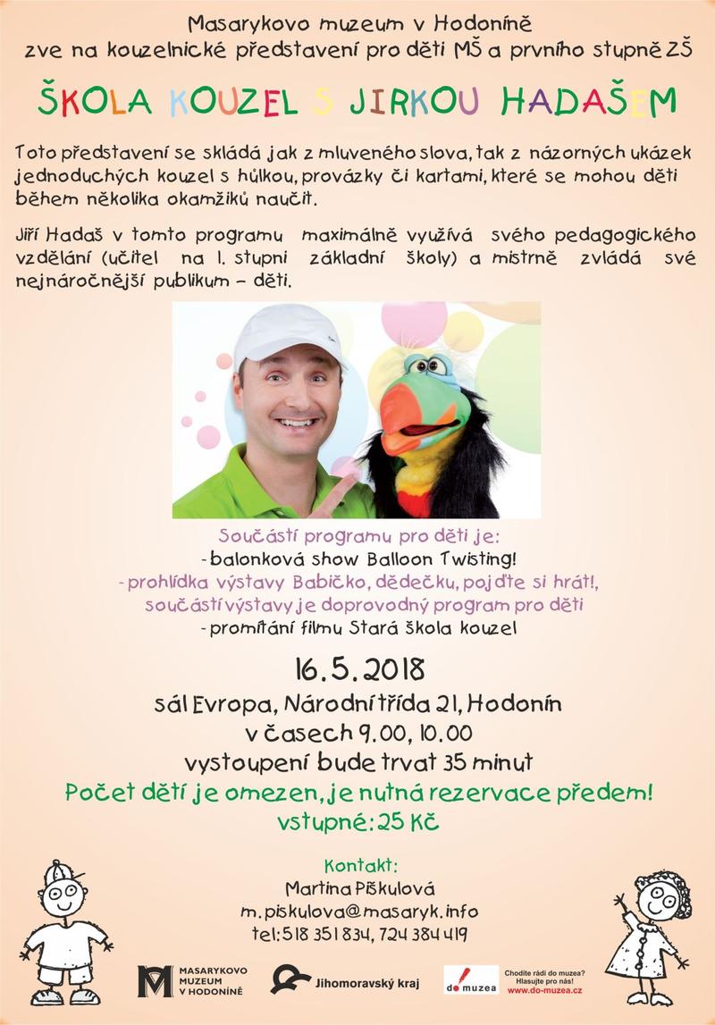 Milé děti, pojďte se podívat na kouzelnické představení Škola kouzel s Jirkou Hadašem. Představení se skládá z ukázek jednoduchých kouzel s hůlkou, provázky či kartami a spoustu dalších triků. Nutná rezervace předem!