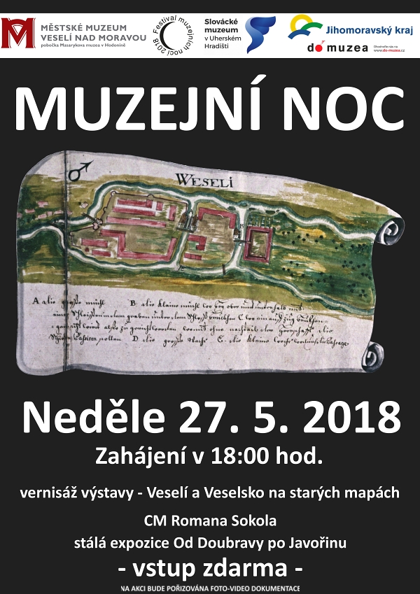Letošní muzejní noc v Městském muzeu Veselí nad Moravou se uskuteční v neděli 27.5.2018, v čase od 18:00 do 22:00 hod. Program zahájí vernisáž výstavy Veselí a Veselsko na starých mapách. Výstava návštěvníka provede historií mapového zobrazování města Veselí a regionu Veselska. Mapy Fabriciova, Komenského, Müllerova - mapy 1. - 3. vojenského mapování - stabilní katastr - to vše, a mnohé další, si zde bude možno prohlédnout. Po celou dobu bude kromě výstavy samotné samozřejmě volně přístupná také stálá expozice OD DOUBRAVY PO JAVOŘINU. O kulturní program se postará Horňácká CM Romana Sokola.
