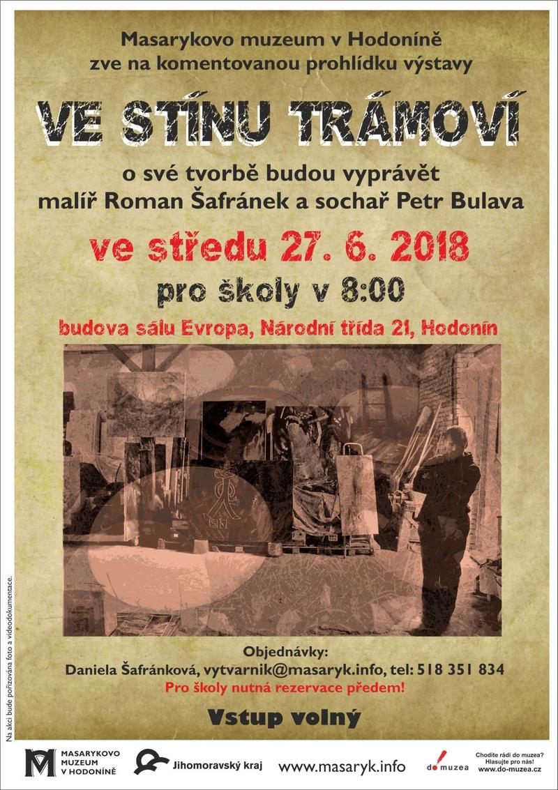 Milí studenti, Masarykovo muzeum v Hodoníně Vás zve na komentovanou prohlídku výstavy Ve stínu trámoví. O své tvorbě budou vyprávět malíř Roman Šafránek a sochař Petr Bulava. Přednáška se uskuteční ve středu 27. června 2018 v 8.00 hodin v budově sálu Evropa. Nutná rezervace (kapacita omezena) na tel. 518 351 834 nebo emailem na vytvarnik@masaryk.info