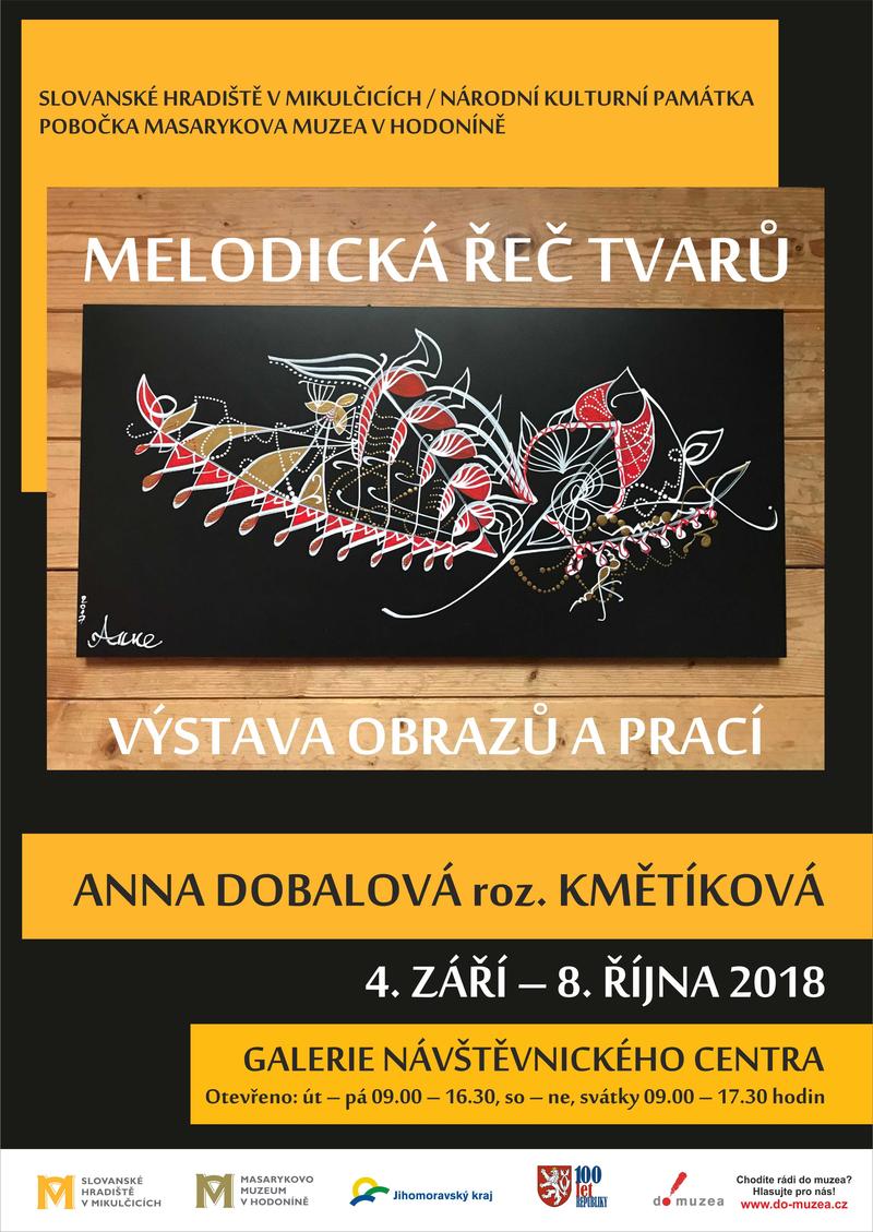 Srdečně zveme na další výstavu. Tentokrát se Vám se svými díly představí rodačka z Dubňan u Hodonína, paní Anna Dobalová, rozená Kmětíková, která trvale žije v Praze. Tato mladá a inspirativní idealistka, mudrlantka a světlonoš obdivuje cesty života, miluje jeho proměny a především malování. Svá díla vytváří tužkou, fixem, tuší, uhlem, akrylem, olejem, inkoustem i eko-barvami na textil a hedvábí. Její tvorba obsahuje prvky geometrie, melodie i aspekty přírody a ženství. Vzhledem k rozmanitosti své osobnosti miluje pohyb, tanec,prózu i poezii a astrologii. Ráda inspiruje a nechá se inspirovat.