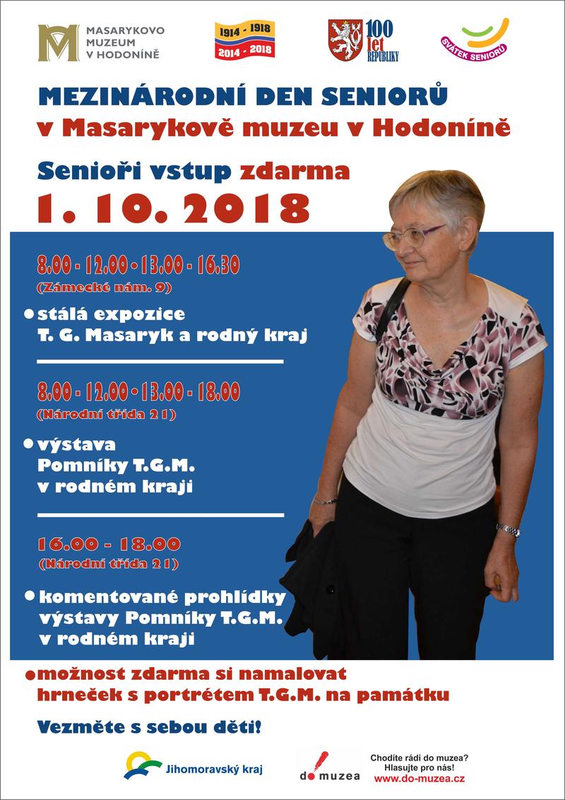 Masarykovo muzeum v Hodoníně nabízí 1. října od 8 do 16.30 seniorům vstup zdarma. V zámečku mohou navštívit expozici věnovanou Masarykovi, v budově na Národní třídě výstavu Pomníky T. G. M. v rodném kraji. Zde se mohou od 16 do 18 hodin zúčastnit komentovaných prohlídek a namalovat zdarma na památku, třeba i s dětmi, hrneček s Masarykovým portrétem.