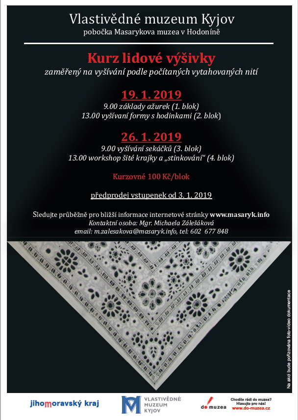 Vlastivědné muzeum Kyjov zve zájemce na Kurz lidové výšivky zaměřený na vyšívání podle počítaných vytahovaných nití dne 19. a 26. 1. 2019. na kurzu se naučíte základy ažurek, vyšívaní formy s hodinkami, vyšívání sekáčků a poslední blok bude věnován workshopu šité krajky a „stinkování“.