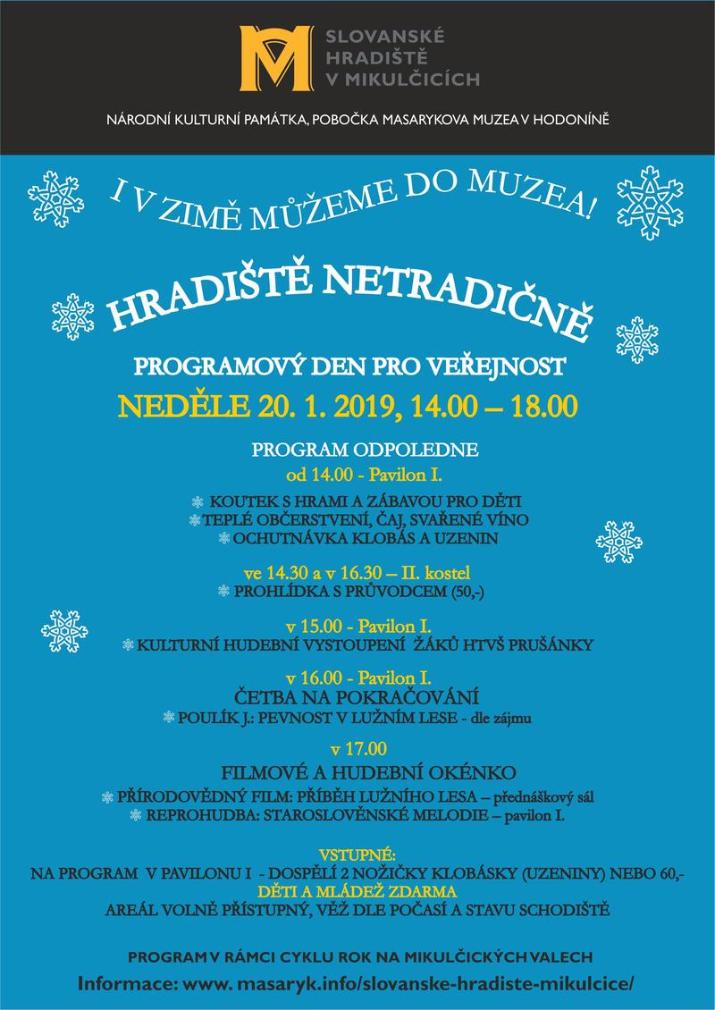 Programovým víkendem pro školy a veřejnost otevíráme opět bohatou celoroční nabídku kulturních a poznávacích programů roku 2019. Kromě možnosti návštěvy památníku v zimních měsících pracovních dnech s prohlídkami v 10.30, 12.30 a 14.30 hodin, zveme širší veřejnost v neděli 20. ledna odpoledne na program Hradiště netradičně - Nový rok na mikulčických Valech. Nabízíme: hry pro děti, prohlídky pavilonu II, kulturní vystoupení, četbu z knihy J. Poulíka, filmové a hudební okénko a také teplé občerstvení a ochutnávku klobás a uzenin. V rámci našeho motta: I v zimě můžete do muzea! vás všechny srdečně zveme k netradiční návštěvě zimního památníku. -fs-