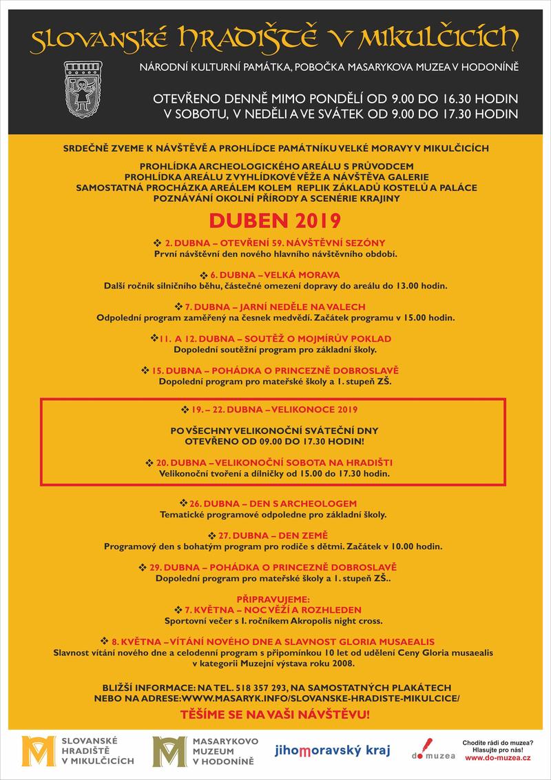 První měsíc hlavní 59. návštěvní sezóny nabízí široké spektrum kulturních, vzdělávacích a doprovodných akcí. Jejich přehled najdete na měsíční nabídce. Věříme, že si mezi nimi vyberete. Srdečně vás zveme a nejvíce během některého z velikonočních dnů. O Velikonocích máme totiž otevřeno po všechny sváteční dny včetně státních svátků Velký pátek a Velikonoční pondělí. Na Bílou sobotu navíc je připraven odpolední sváteční program. Pěkné zážitky při návštěvě památníku přejí jeho zaměstnanci. -fs-
