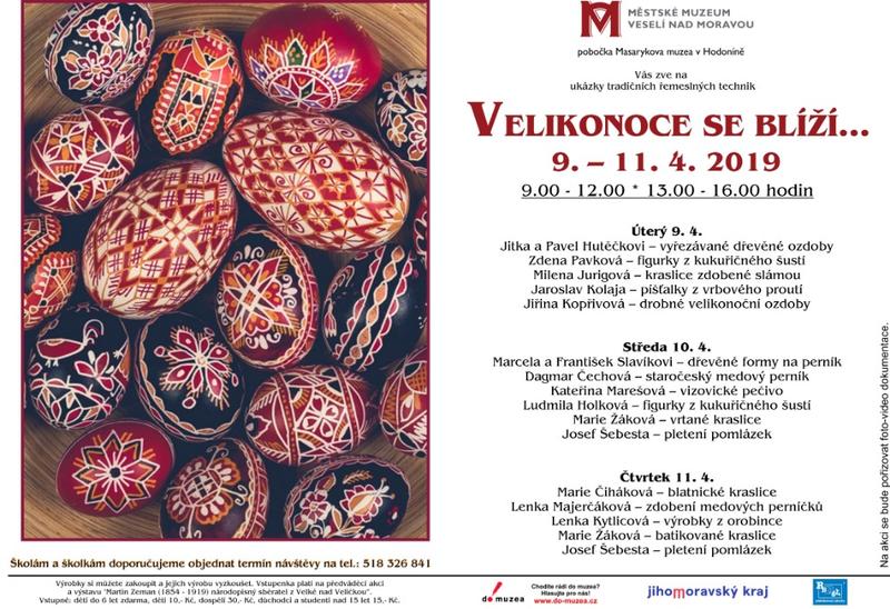 Od úterka 9. do čtvrtka 11. dubna 2019 se v Městském muzeu ve Veselí nad Moravou uskuteční velikonoční předváděcí akce s ukázkami různých tradičních řemeslných technik. Každý den návštěvníci uvidí různé způsoby zdobení velikonočních kraslic, zpracování přírodních pletiv (orobinec, kukuřičné šustí), výrobu a zdobení perníků, vizovického pečiva, výrobu velikonočních ozdob, forem na perník, píšťalek i pletení pomlázek. Zájemci si budou moci vyzkoušet pod vedením odborníků svou zručnost při zhotovování jednotlivých výrobků. Někteří předvádějící patří mezi lidové řemeslníky oceněné v posledních letech titulem „Mistr tradiční rukodělné výroby Jihomoravského kraje“.